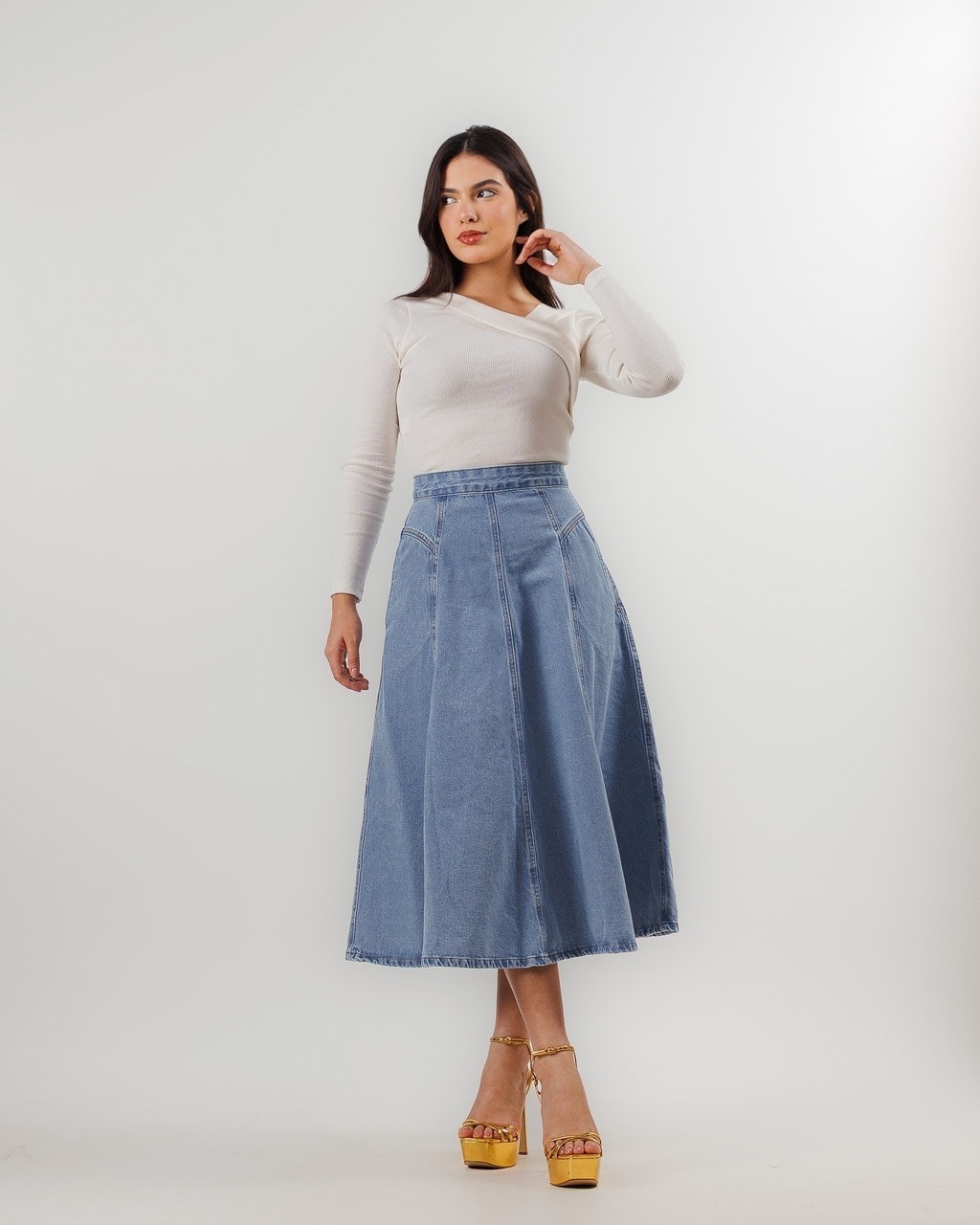 Delicada e versátil, essa saia é a escolha ideal para quem busca feminilidade com praticidade. Em tom claro e modelagem godê, ela valoriza a silhueta com cintura alta e recortes que garantem caimento impecável. Possui zíper discreto nas costas e bolsos faca funcionais, trazendo charme e conforto ao dia a dia. Uma peça atemporal que transita facilmente entre produções casuais e sofisticadas.